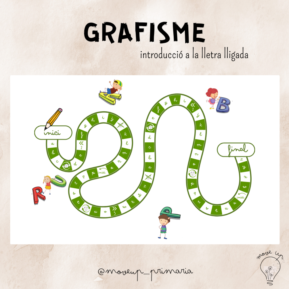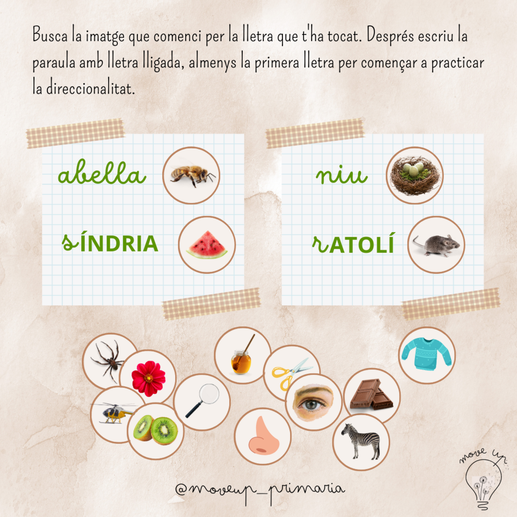 Practica la lletra lligada a partir del joc de taula que et proposo. Busca una imatge que comenci per la lletra que t'ha tocat i podràs continuar la partida.